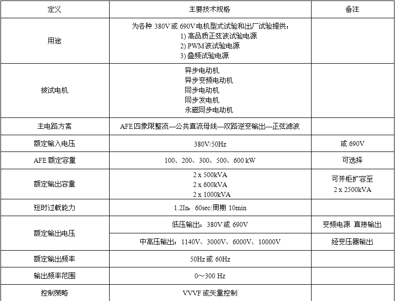 380V/690V系列电机试验静止变频电源是我公司开发的专门面向电动机和发电机型式试验和出厂试验的系列化变频电源系列化产品,广泛适用于异步电机、变频电机、同步电机和永磁同步电机的各种试验。该系列产品系列采用AFE四象限整流、公共直流母线、双路逆变和组合式正弦滤波技术方案,不仅可以直接为380V和690V(含690V)各种电机试验提供高质量的变频电源,还可以通过输出变压器为1140V、3000V、6000V和10000V各种电机试验提供高质量的变频电源。多年来,在广大客户的支持下,我公司的380V/690V系列标准化电机试验静止变频电源系列产品以其技术成熟、性能先进、功能齐全、品质优良、结构紧凑、价格低廉、使用方便和服务优质等诸多优势博得了客户的好评,在各种电动机和发电机型式试验和出厂试验领域以及电机研发领域获得了广泛运用。