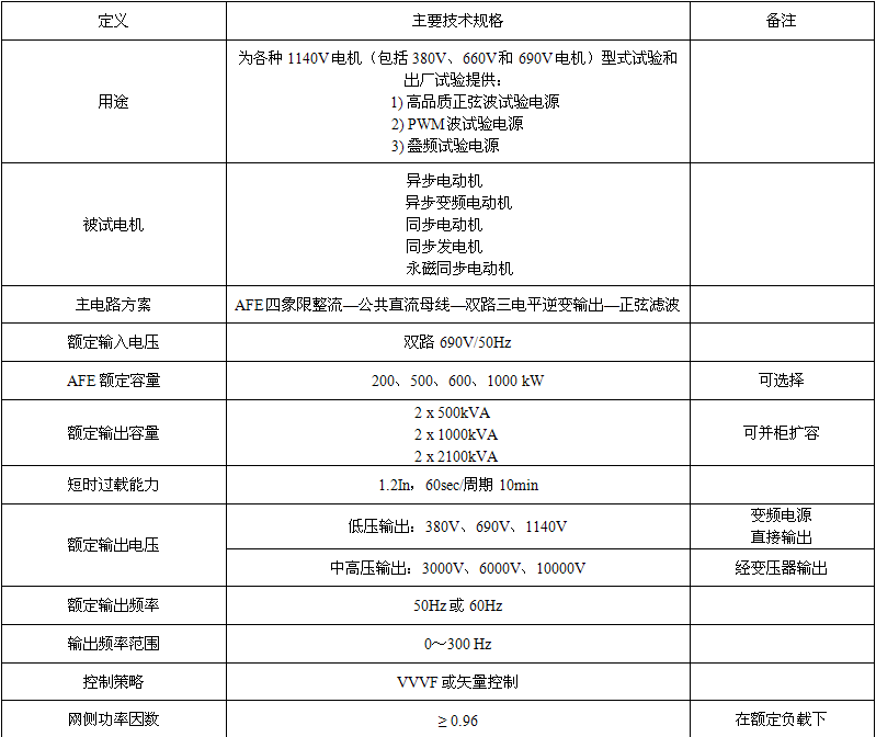 1140V系列电机试验静止变频电源是我公司开发的专门面向电动机和发电机型式试验和出厂试验的系列化变频电源系列化产品,广泛适用于异步电机、变频电机、同步电机和永磁同步电机的各种试验。该系列产品系列采用AFE四象限整流、公共直流母线、三电平双路逆变和组合式正弦滤波技术方案,不仅可以直接为380V、690V(含690V)和1140V各种电机试验提供高质量的变频电源,还可以通过输出变压器3000V、6000V和10000V各种电机试验提供高质量的变频电源。多年来,在广大客户的支持下,我公司的1140V系列标准化电机试验静止变频电源系列产品以其技术成熟、性能先进、功能齐全、品质优良、结构紧凑、价格低廉、使用方便和服务优质等诸多优势博得了客户的好评,在各种电动机和发电机型式试验和出厂试验领域以及电机研发领域获得了广泛运用。
